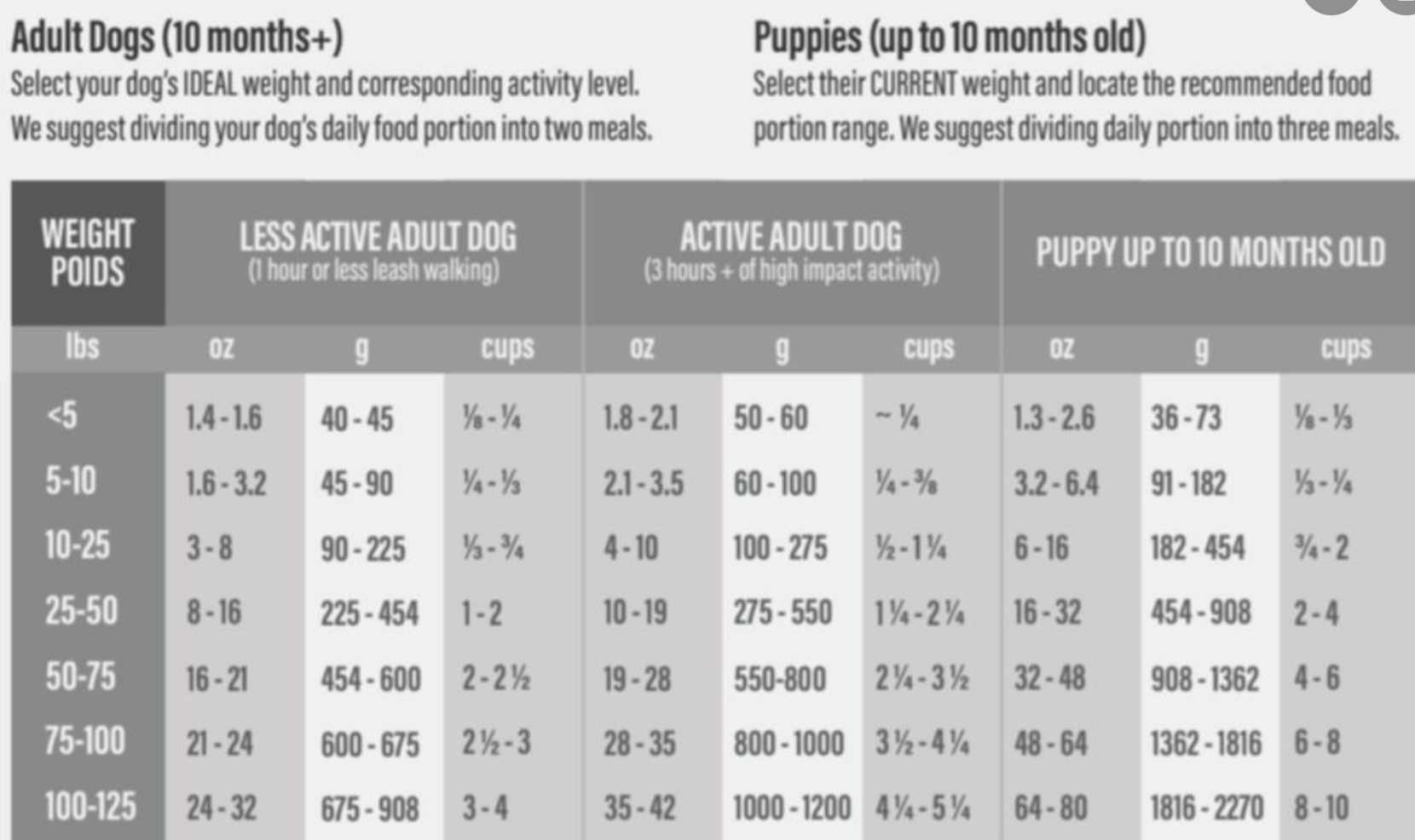 Puppies up to 10 months of age need to be fed 3x a day. We feed at 6:30 am, noon and 6pm. Adult dogs over 10 months of age should be fed 2 meals a day: breakfast and supper.